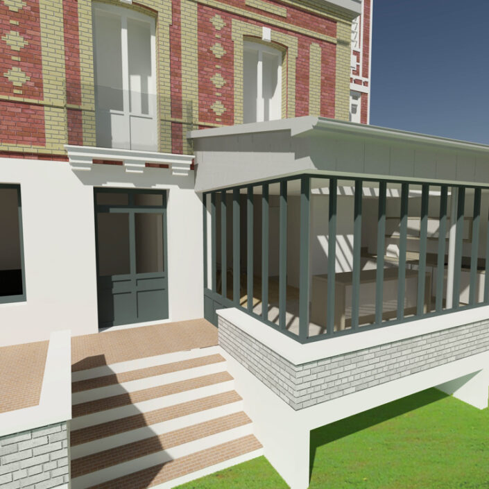 Création d’un volume vitré destiné à y déplacer la cuisine et d’une terrasse en vis à vis. Ce projet nous a amené à repenser intégralement le niveau RDC.